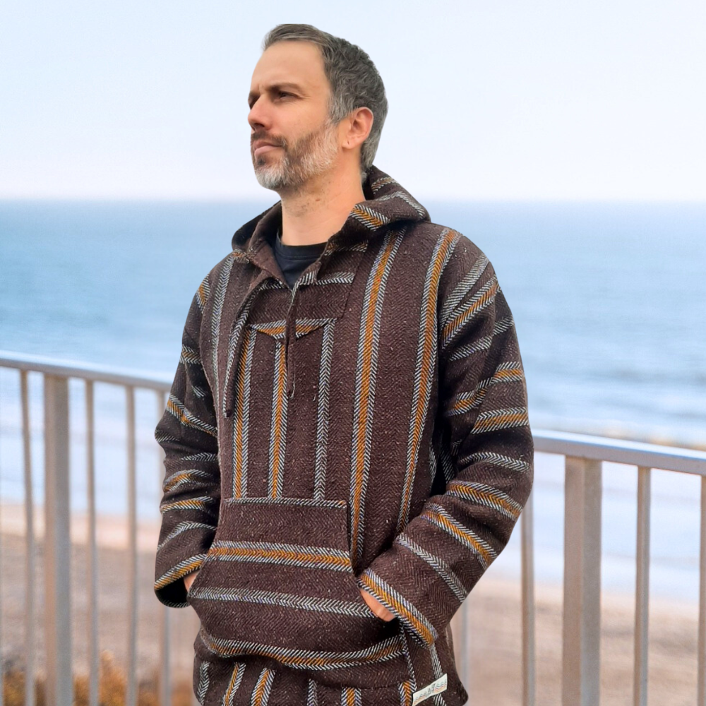 Unisex Baja Hoodie with a laid back and relaxed fit. This is a soft, high quality handmade baja poncho, with a softly brushed inside lining making it 100% comfy and not itchy.
