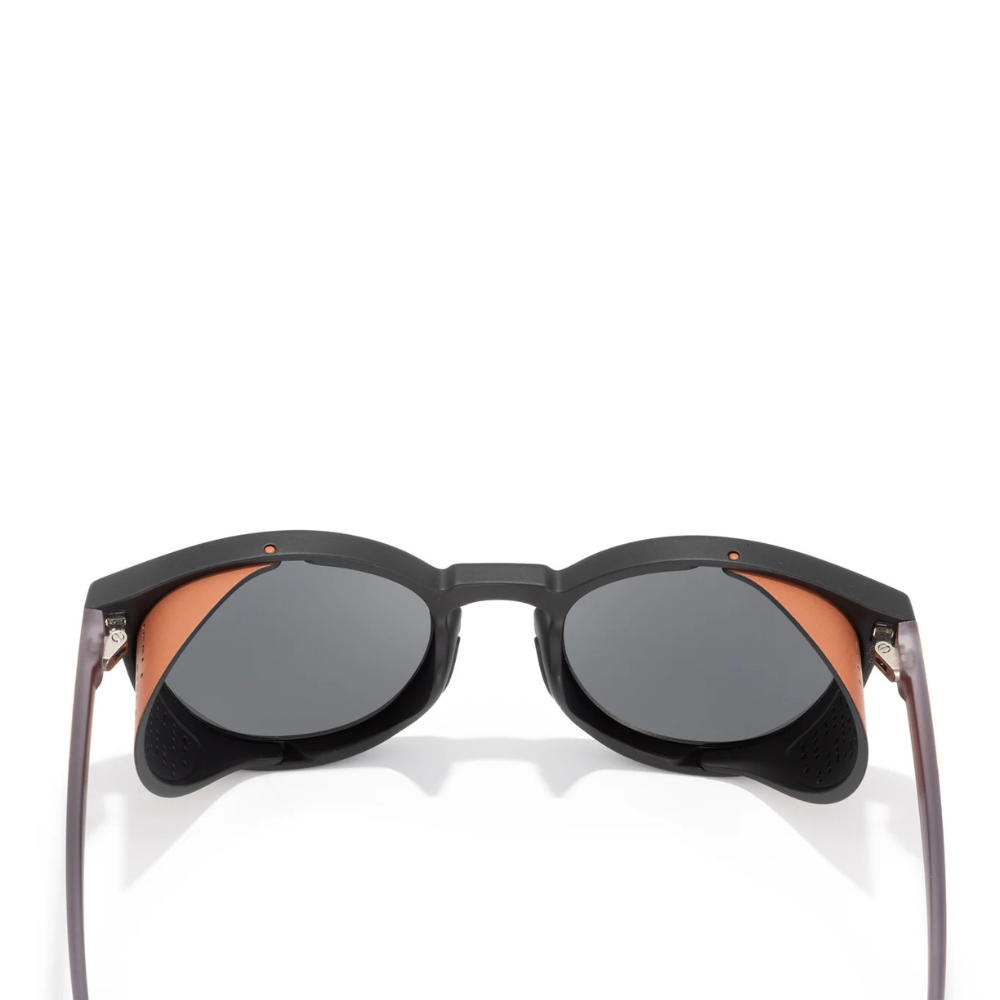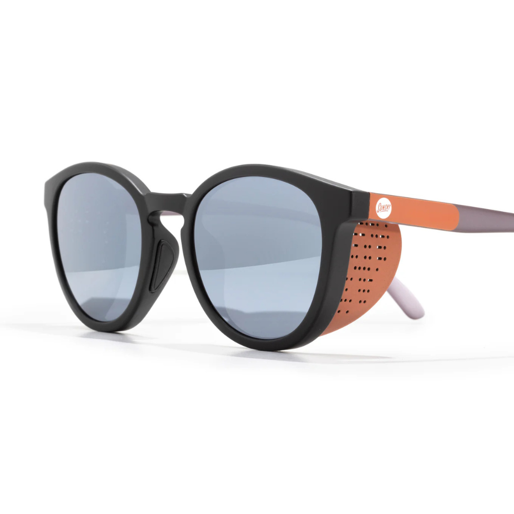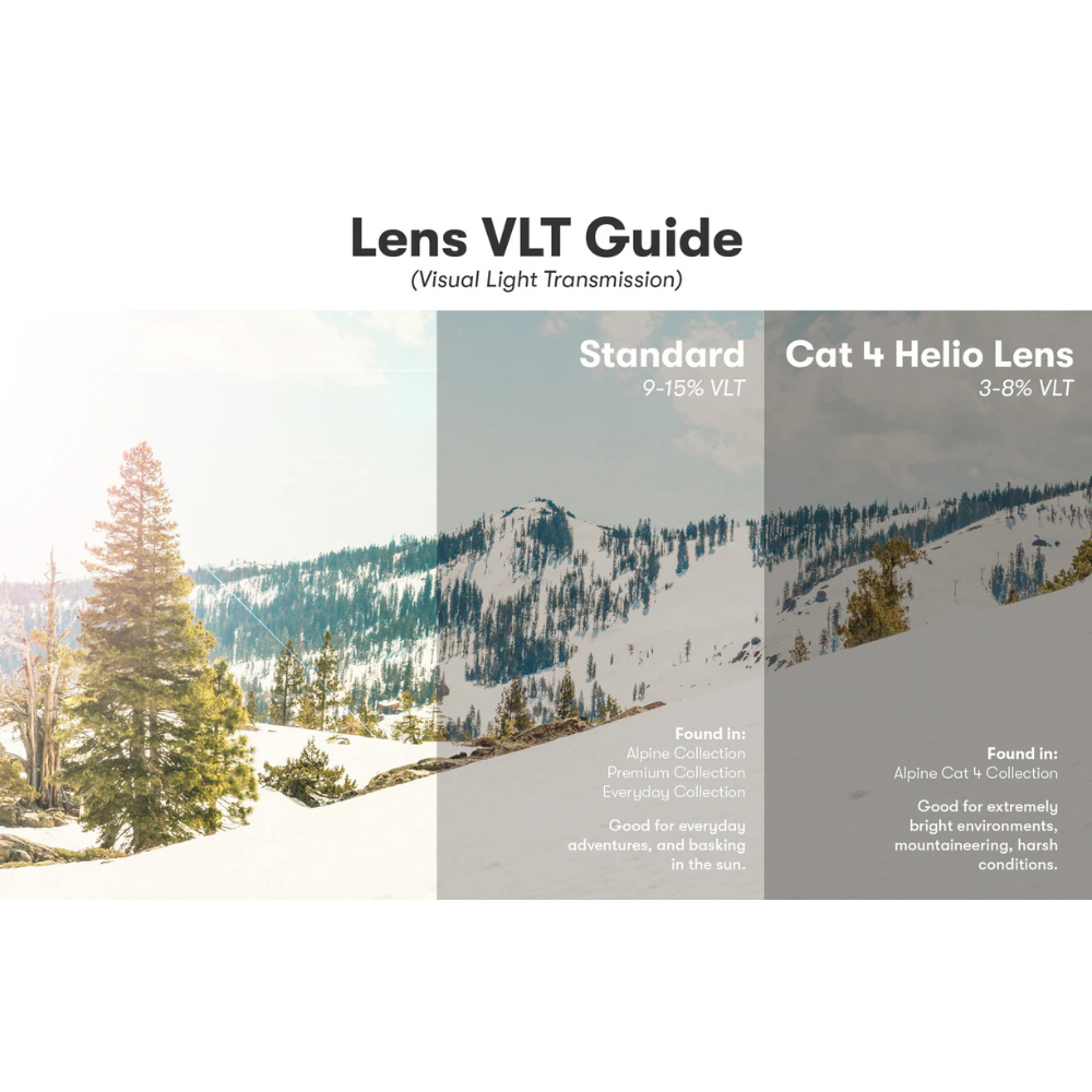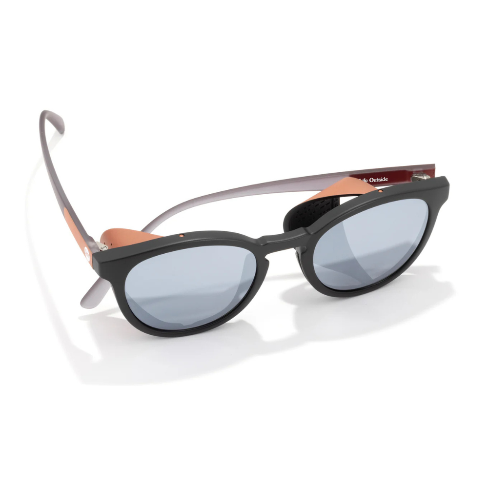 A classic round silhouette that takes you back to early mountaineering and vintage skiing days. These frames will have you itching to hit the slopes or go explore your local mountain. The Tera is a medium sized frame that fits small to medium sized heads and most head shapes. Sculpted nose pads and arms are designed to provide just the right amount of grip without causing discomfort ensures a comfortable fit in all elements. Fit check: sun shields should fit close to the face without creating pressure. With our Helio polycarbonate lenses, all Teras are polarized, block 100% UVA/UVB/UV400 wavelengths and pass the FDA basic impact test. Featuring low VLT (Visual Light Transmition). Alpenglow: Mirror, Slate tint, 12% VLT, Base 4 Curve.